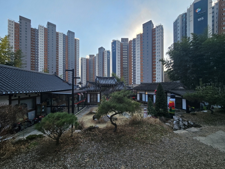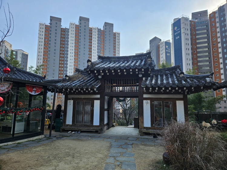 한옥 카페의 주요 건물인 안채의 뒤로 산이 있다면, 안채에서 바라보는 대문 너머 보이는 풍경은 전혀 색다른 고층 아파트가 보였습니다. 너와숲 한옥 카페의 대지가 높아서 멋진 풍경을 가질 수 있을 듯했지만 고층 아파트가 가로막아서 버티고 있는 모습을 보니 조금은 씁쓸하고 아쉬웠습니다. 하지만 그걸 제외하더라도 마당과 기와지붕을 보고 있으면 그리 답답한 느낌이 들지는 않았습니다.