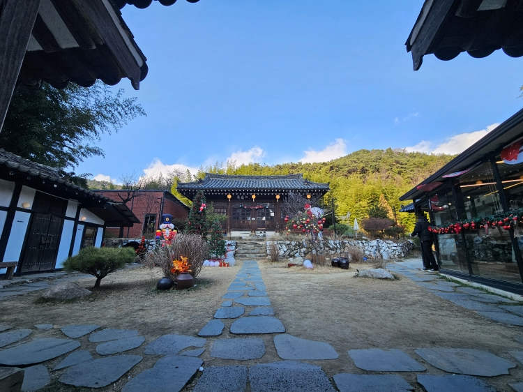 계단을 올라가 대문으로 들어서서 본모습입니다. 크리스마스이브에 방문이라 여기저기 크리스마스 분위기로 꾸며져 있는 한옥의 모습과 뒤로 보이는 작은 산이 생각보다 잘 어울리고 예뻤습니다.
