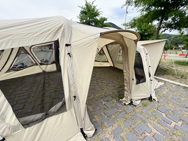 에어텐트는 텐트를 바닥에 넓게 펼친 후 가장자리 부분 기본적인 팩만 박은 후 에어를 주입시켜 주면 텐트가 자립하여 힘도 많이 들지 않고 시간도 얼마 소요하지 않아 큰 매력이 있는 제품입니다.