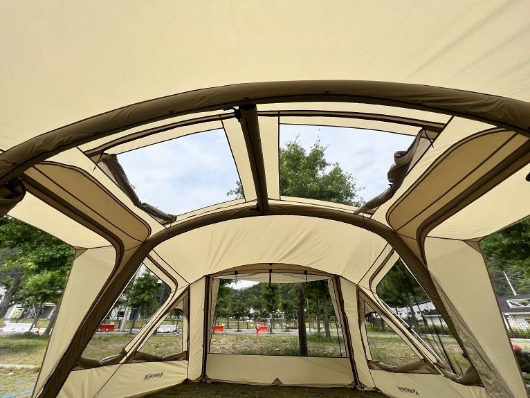일체형 에어빔 시스템으로 공기 주입구 한 곳만 공기를 주입해도 텐트 전체를 자립시킬 수 있답니다.