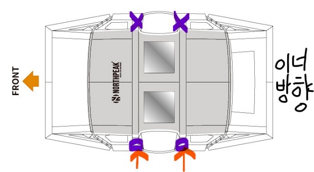 공기 주입구는 텐트의 한쪽면 출입구에 2개 있습니다.